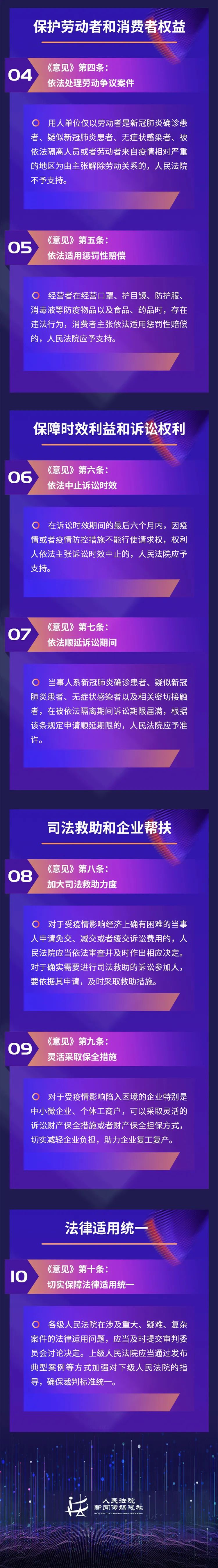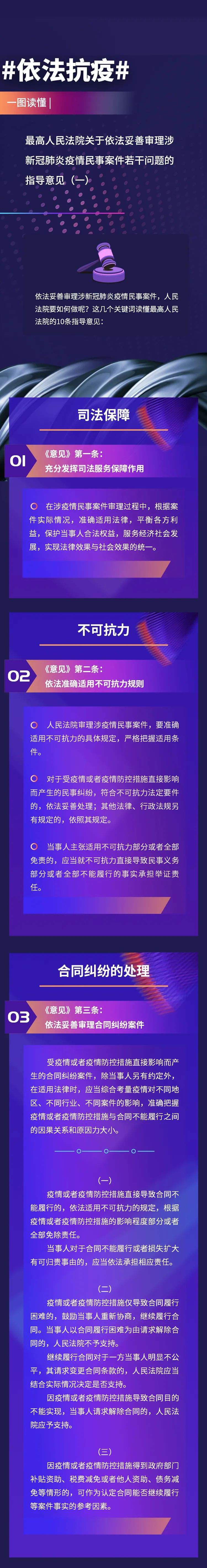 日前,最高人民法院印發(fā)《關(guān)于依法妥善審理涉新冠肺炎疫情民事案件若干問題的指導(dǎo)意見(一)》(以下簡稱《意見》),為人民法院依法妥善審理涉新冠肺炎疫情民事案件,維護(hù)人民群眾合法權(quán)益,維護(hù)社會(huì)和經(jīng)濟(jì)秩序,維護(hù)社會(huì)公平正義,提出具體措施。通過這幾個(gè)關(guān)鍵詞,讀懂最高人民法院的十條指導(dǎo)意見: