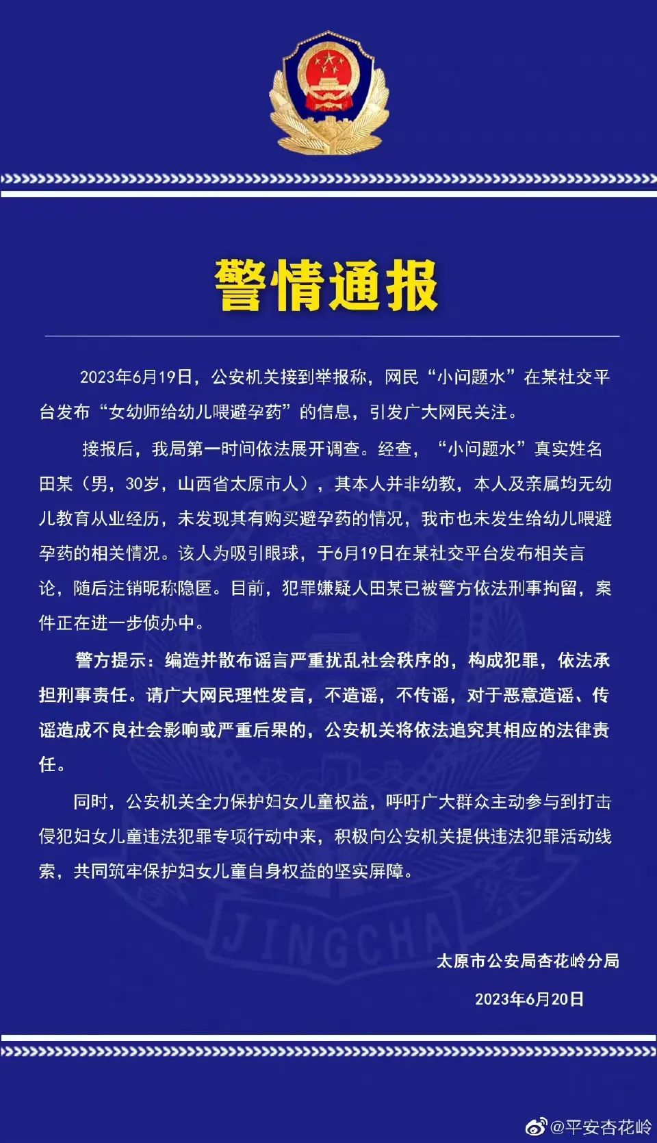 接報后,我局第一時間依法展開調查。經查,“小問題水”真實姓名田某(男,30歲,山西省太原市人),其本人并非幼教,本人及親屬均無幼兒教育從業經歷,未發現其有購買避孕藥的情況,我市也未發生給幼兒喂避孕藥的相關情況。該人為吸引眼球,于6月19日在某社交平臺發布相關言論,隨后注銷昵稱隱匿。目前,犯罪嫌疑人田某已被警方依法刑事拘留,案件正在進一步偵辦中。