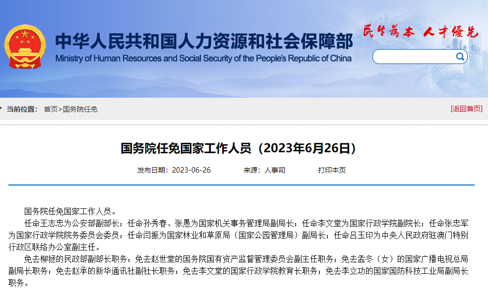任命王志忠為公安部副部長;任命孫秀春、張愚為國家機關事務管理局副局長;任命李文堂為國家行政學院副院長;任命張忠軍為國家行政學院院務委員會委員;任命閆振為國家林業和草原局(國家公園管理局)副局長;任命呂玉印為中央人民政府駐澳門特別行政區聯絡辦公室副主任。