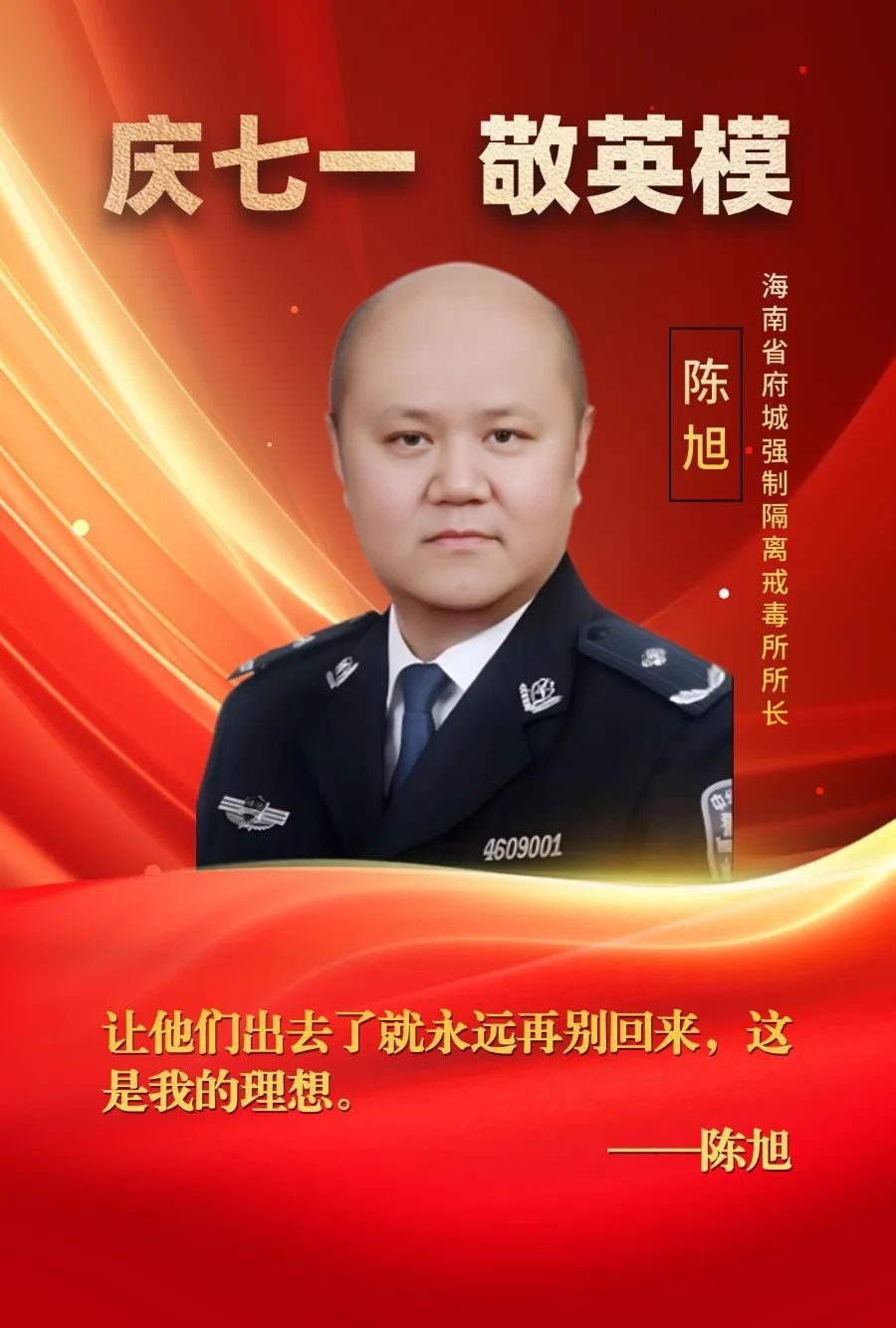 陳旭,原海南省府城強(qiáng)制隔離戒毒所黨委書記、所長(zhǎng),一級(jí)高級(jí)警長(zhǎng)。其牽頭探索的“五位一體”戒毒模式,被司法部命名為“海南戒毒模式”。因公殉職后,被追授為“全國司法行政系統(tǒng)一級(jí)英雄模范”“海南省優(yōu)秀共產(chǎn)黨員”、追記一等功。