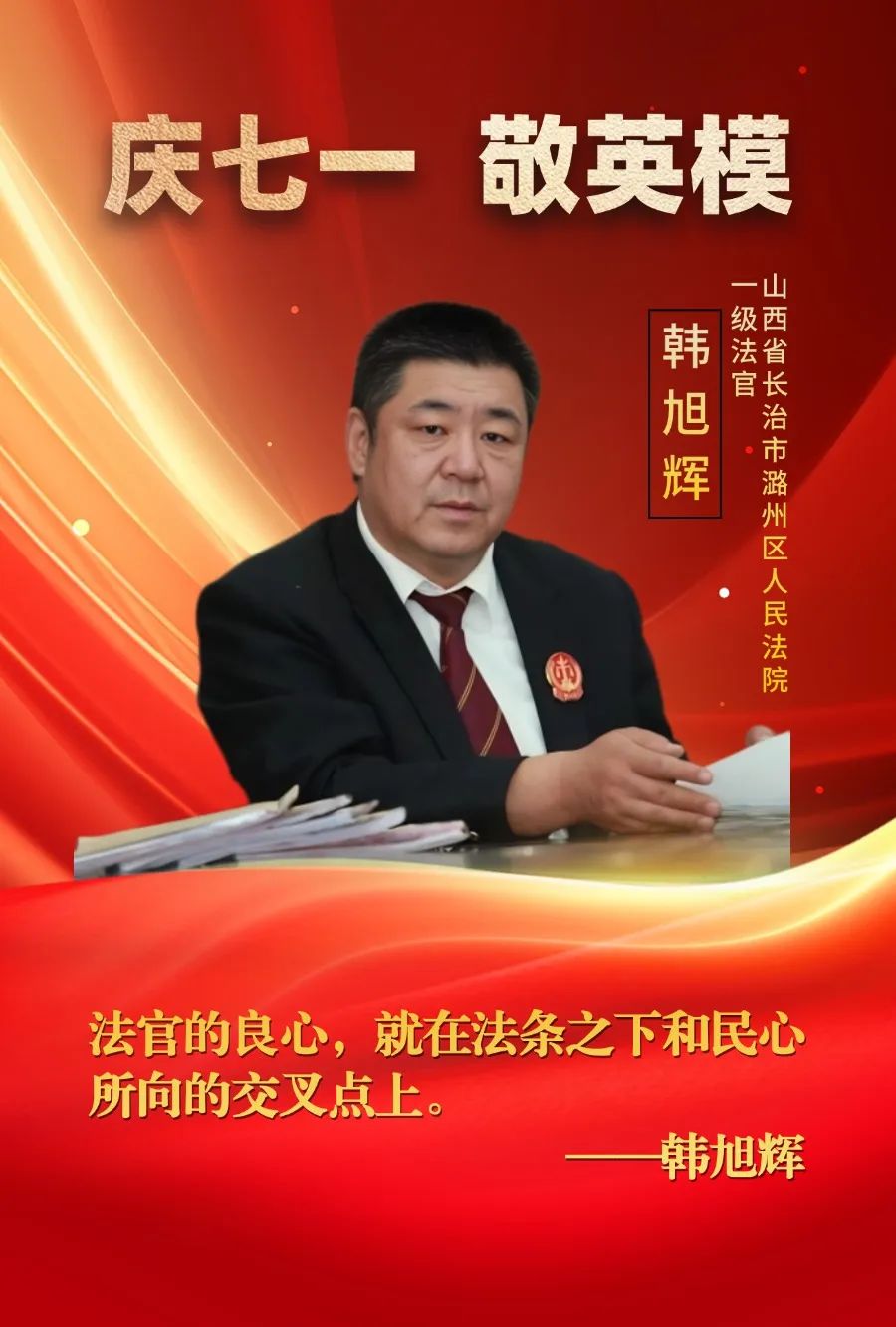 韓旭輝,原山西省長治市潞州區人民法院一級法官。2023年3月,在準備第二天開庭工作時,突發心臟病不幸去世,終年59歲。司法為民一線奮斗33年,韓旭輝對黨忠誠、恪盡職守,以恒心踐初心、以生命擔使命,曾榮立個人三等功3次,被追授“全國法院先進個人”“全國模范法官”“山西省優秀共產黨員”稱號。