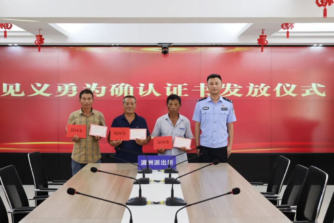 ▲8月11日下午,北岸分局為漁民周春粦、周文景、周金泉頒發(fā)見義勇為確認(rèn)證書及慰問金。