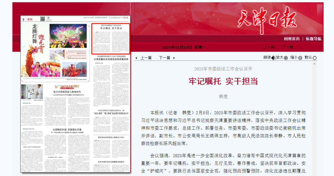 會議強調,2025年是進一步全面深化改革、奮力譜寫中國式現代化天津篇章的重要一年,要牢記囑托、實干擔當,見行見效、善作善成,堅決筑牢首都政治、安全“護城河”。要踐行總體國家安全觀,強化預測預警預防,深化反滲透反顛覆反恐怖反邪教斗爭,堅決捍衛國家政治安全;要推動落實維護社會穩定責任制,著力防范化解突出涉穩風險,加強社會治安整體防控體系建設,推進社會治安綜合治理中心規范化建設,努力建設更高水平的平安天津;要全面推進科學立法、嚴格執法、公正司法、全民守法,以高水平法治服務高質量發展,努力建設更高水平的法治天津;要落實和完善黨管政法工作制度,堅持黨對政法工作的絕對領導,加強紀律作風建設、履職能力建設、干部隊伍建設,鍛造忠誠干凈擔當的津門政法鐵軍,為全面建設社會主義現代化大都市、譜寫中國式現代化天津篇章提供堅強安全保障。