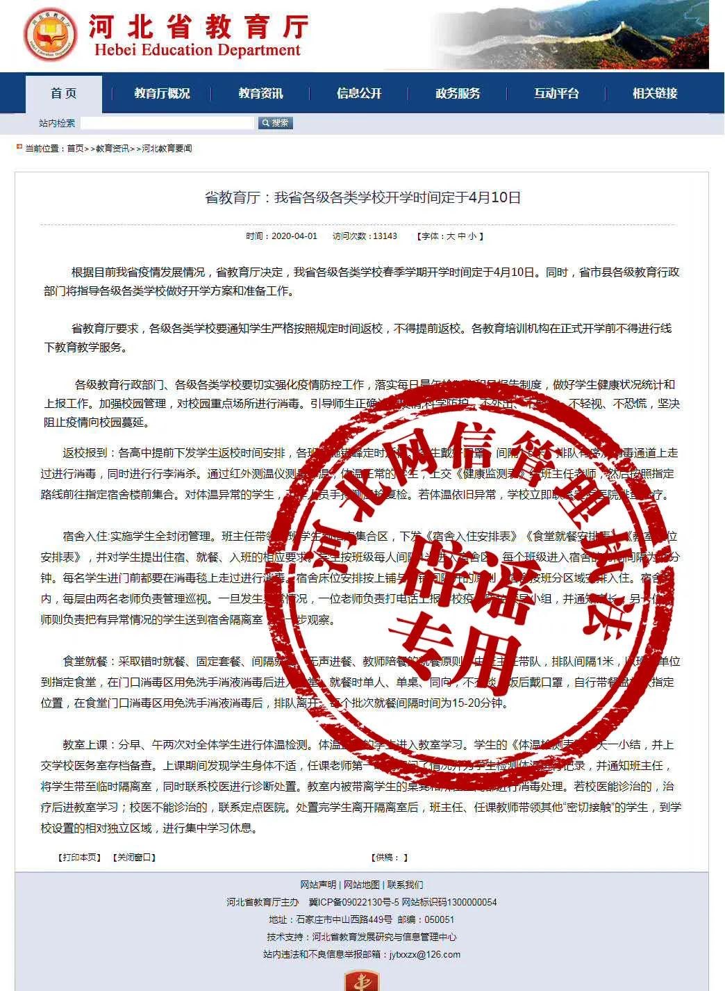 近日,一則“河北省教育廳關于各級各類學校開學時間定于4月10日的通知”在網絡上流傳。那這則消息是真的嗎?經河北省網信辦與河北省教育廳官方網站工作人員核實,今天在教育廳官網上,并未發布相關類似信息。