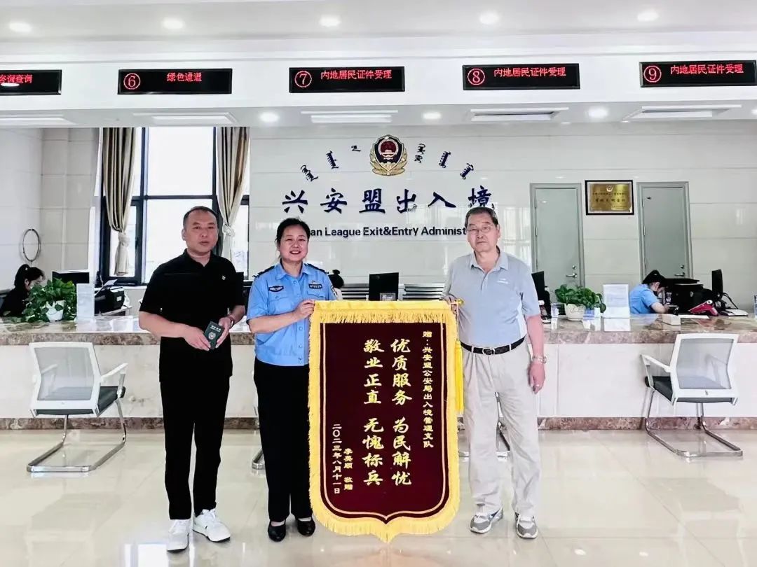 近日,一對身在韓國的老兩口委托親友將印有“優(yōu)質(zhì)服務(wù)為民解憂敬業(yè)正直無愧標(biāo)兵”的錦旗送到興安盟公安局出入境管理支隊民警手中。