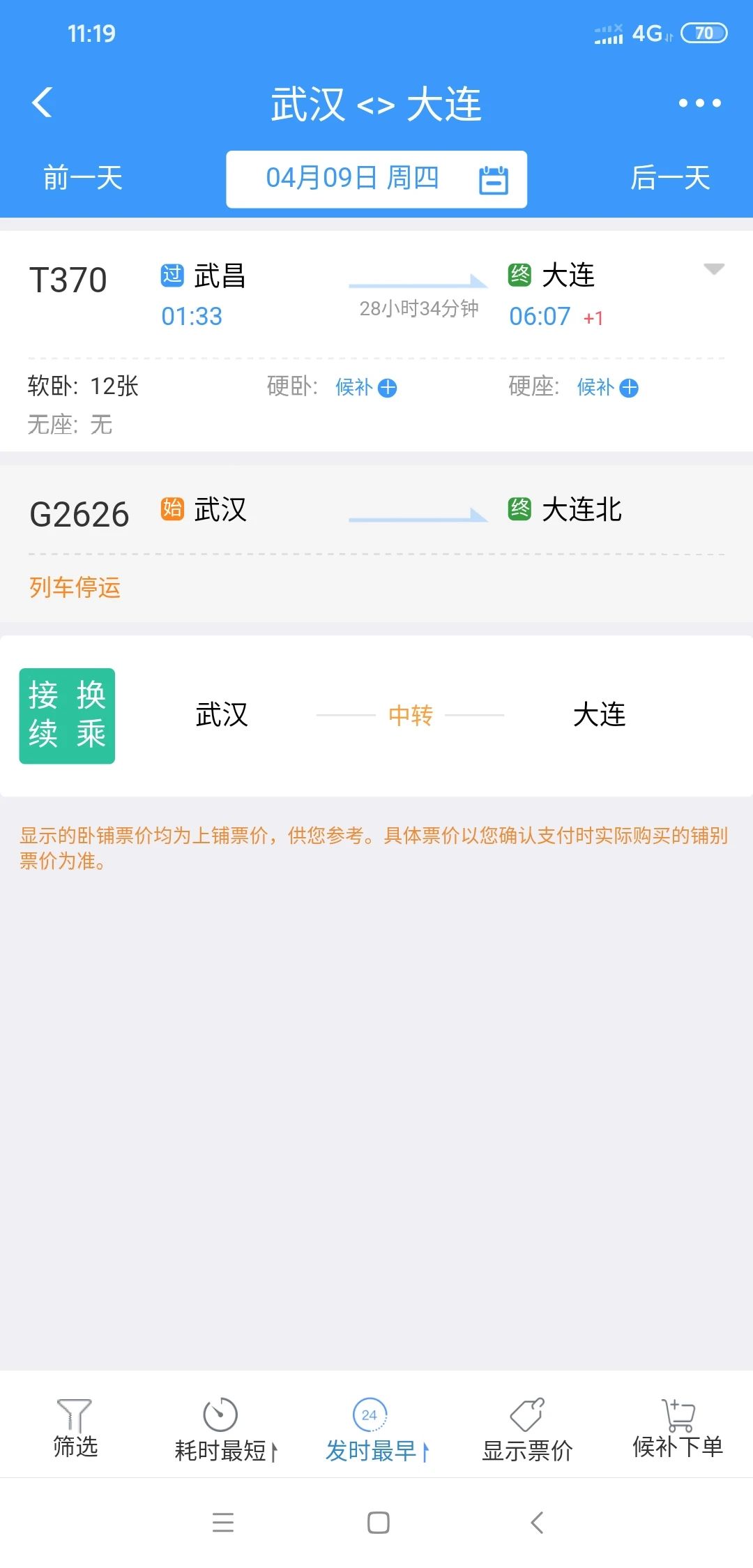 另據記者查詢12306網站,從4月8日起,從武漢地區開往大連的旅客列車,只有每天1時33分從武昌站始發的T370次普速列車,而此次列車全程運行時間長達28小時34分,4月8日開行列車,4月9日6時07分才終到大連。4月8日全天,大連并無武漢方向列車到站。