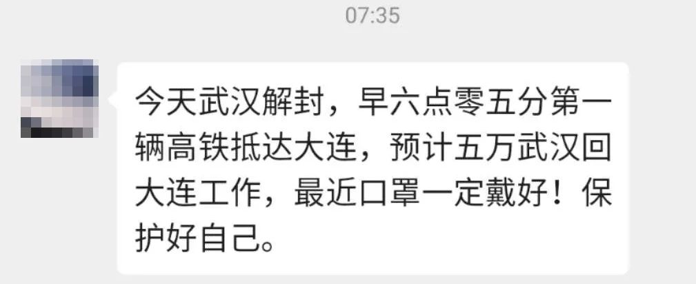 今天武漢解封,早六點零五分第一輛高鐵抵達大連,預計五萬武漢人回大連工作,最近口罩一定戴好!保護好自己。