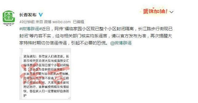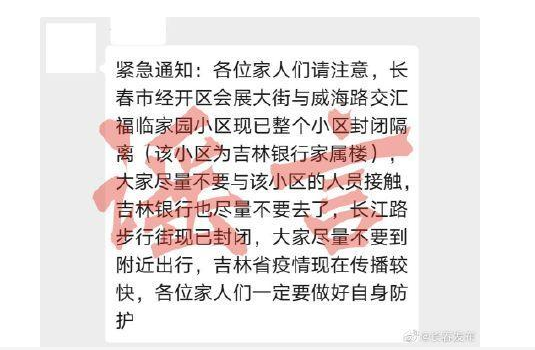 據(jù)中共長春市委網(wǎng)絡(luò)安全和信息化委員會辦公室@長春發(fā)布5月12日消息,近日,網(wǎng)傳“福臨家園小區(qū)現(xiàn)已整個(gè)小區(qū)封閉隔離,長江路步行街現(xiàn)已封閉”等內(nèi)容不實(shí),經(jīng)與相關(guān)部門核實(shí)均系謠言,請以官方發(fā)布為準(zhǔn),再次提醒大家特殊時(shí)期切勿信謠傳謠,引起不必要的恐慌。