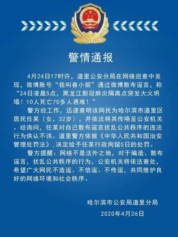 “24日凌晨5點,黑龍江新冠肺炎隔離點突發大火坍塌!10人死亡70多人遇難!”近日,一名微博賬號“我叫春小妮”的女子通過微博將此消息發布,冰城警方核查發現此事并未發生,屬于謠言。目前,女子已被拘留。