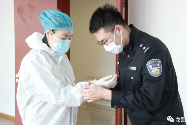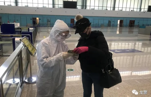4月6日下午,王蕾在勤務(wù)間隙,發(fā)現(xiàn)正在入境大廳門口消毒的民警防護(hù)服上寫著郭鴻劍的名字,他趕緊走上前,發(fā)現(xiàn)果然是愛人郭鴻劍,兩人匆匆在大廳見了一面,相互囑咐一句“注意安全”,就各自忙各自的工作了。
