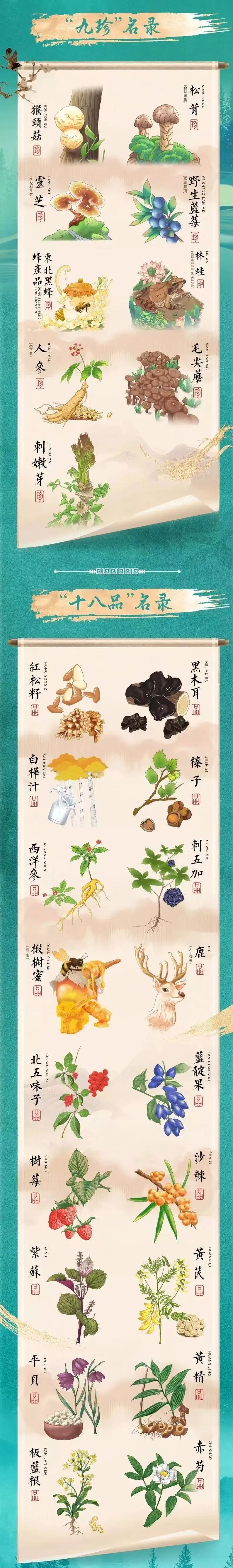 “九珍”:以珍稀、珍貴、珍饈為標準,包括猴頭菇、松茸、靈芝、野生藍莓、黑蜂蜂產品、林蛙、人參、毛尖蘑、刺嫩芽,突出自然饋贈的稀缺性與高價值。