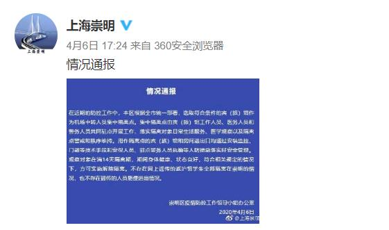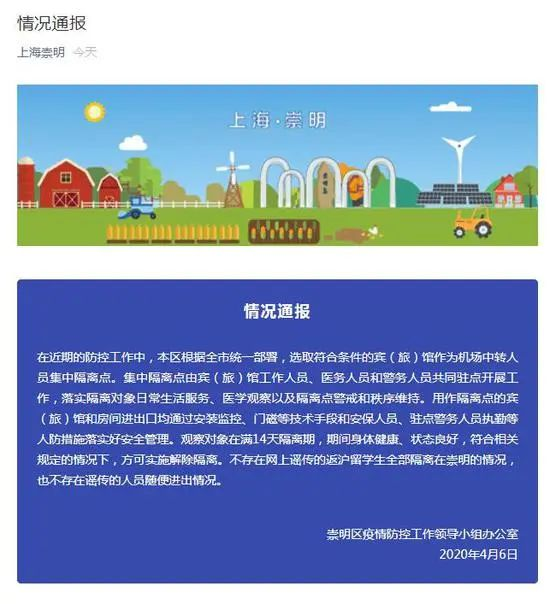 針對(duì)網(wǎng)上流傳的“返滬留學(xué)生全部隔離在崇明”等消息,“上海崇明”微信公眾號(hào)刊文辟謠,并稱(chēng)“也不存在謠傳的人員隨便進(jìn)出情況。”