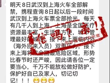 歸納一下這3則傳言,中心思想便是:4月8日起多日的武漢來滬車票已售罄,每天幾千武漢人來到上海。他們中,不乏夾雜著“無癥狀感染者”“復陽者”,這使得上海面臨著巨大的防控壓力。“上海成全國最危險地方”“飯館下不得、公共汽車坐不得”等說法,傳遞出的“焦慮”躍然紙上。而在第3版的傳言中,更傳出“國家不再承擔新增加的新(型)冠狀肺炎患者的醫療費用”之說,讓人看后緊張不已。
