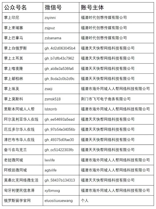 同時(shí),上述雷同文章被人質(zhì)疑系批量生產(chǎn),制造海外疫情恐慌情緒。這些微信公眾號(hào)指向了福建福清三家公司。它們的賬號(hào)主體主要是:福清天天快幫網(wǎng)絡(luò)科技有限公司、福清時(shí)代創(chuàng)想傳媒有限公司和福清市海外同城人人幫網(wǎng)絡(luò)科技有限公司。