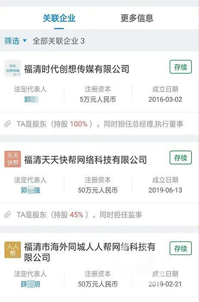 據(jù)不完全統(tǒng)計(jì),這三家公司擁有60多個(gè)微信公眾號(hào)。工商注冊(cè)信息顯示,天天快幫股東名為郭某強(qiáng)和郭某,兩人合資占股100%,法定代表人為郭某強(qiáng),成立時(shí)間為2019年6月。另一家公司時(shí)代創(chuàng)想股東為郭某,持股比例100%,亦為該公司的法定代表人,成立時(shí)間為2016年3月。海外同城人人幫法定代表人為薛某明,成立時(shí)間為2019年2月。
