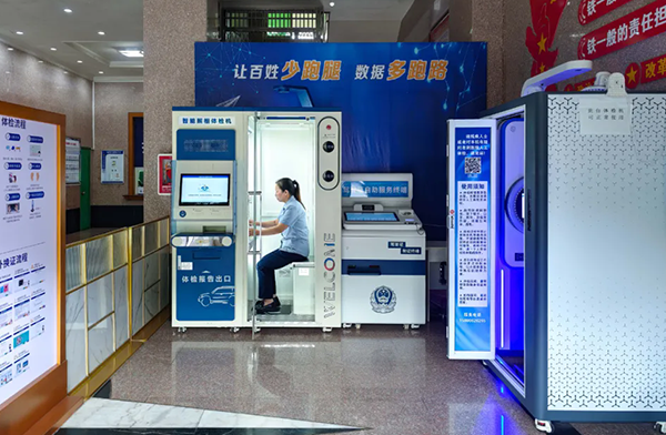 晚上8點(diǎn),永定區(qū)交通指揮中心大樓一樓依舊亮著一盞“便民燈”——這里是“24小時(shí)自助便民車(chē)管所”。在自助體檢機(jī)前,剛結(jié)束晚高峰通勤的陳女士刷身份證、錄入信息、完成視力檢測(cè),再到旁邊的駕駛證制證機(jī)上操作,不到10分鐘,嶄新的駕駛證就從機(jī)器里“吐”了出來(lái)。