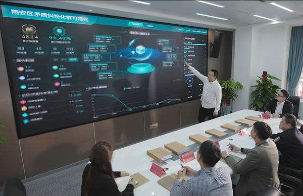 在翔安區(qū)綜治中心指揮調(diào)度區(qū),電子顯示屏實時更新的藍、黃、橙、紅四色標識構(gòu)成動態(tài)治理圖譜,構(gòu)建全域矛盾預(yù)警網(wǎng)絡(luò)。