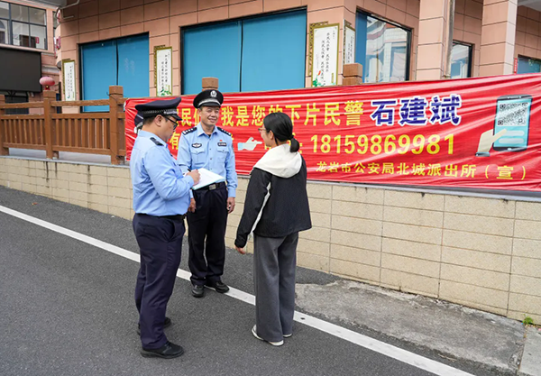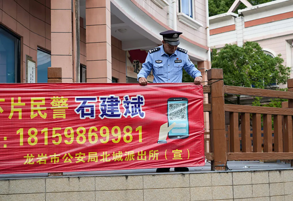 漫步福建龍巖城區(qū)的各社區(qū),路口街角、居民樓邊,常能看到一抹抹亮眼的紅色橫幅——“居民們,我是您的社區(qū)民警XXX,有事聯(lián)系我→電話:xxxxxxxxxxx”。