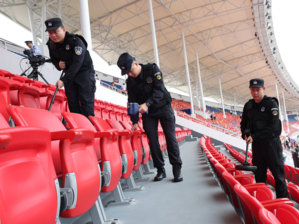 看臺安檢“硬核”護航。(9月20日,益陽公安民警對球場看臺進行全面安全檢查,圖為民警在球場開展搜排爆工作。)