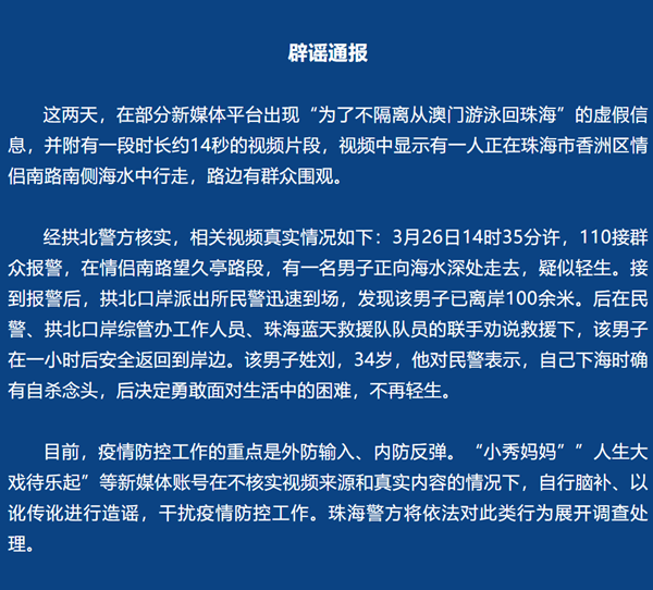 警方介紹,近日,在部分新媒體平臺出現“為了不隔離從澳門游泳回珠?!钡奶摷傩畔?,并附有一段時長約14秒的視頻片段,視頻中顯示有一人正在珠海市香洲區情侶南路南側海水中行走,路邊有群眾圍觀。