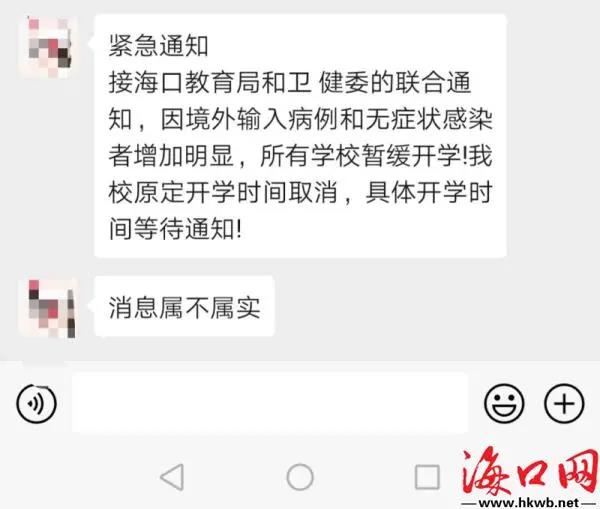 4月12日下午,一則“接海口教育局和衛健委的聯合通知,因境外輸入病例和無癥狀感染者增加明顯,所有學校暫緩開學!我校原定開學時間取消,具體開學時間等待通知”的信息在微信群內流傳。