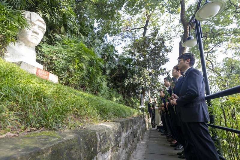 在莊嚴肅穆的劉國鋕烈士雕像前,檢察官與博物館工作人員共同獻上潔白的鮮花,深深鞠躬致敬。一束鮮花,寄托著對革命先烈的無限哀思,也彰顯著新時代檢察人傳承紅色基因、守護英烈榮光的堅定信念。