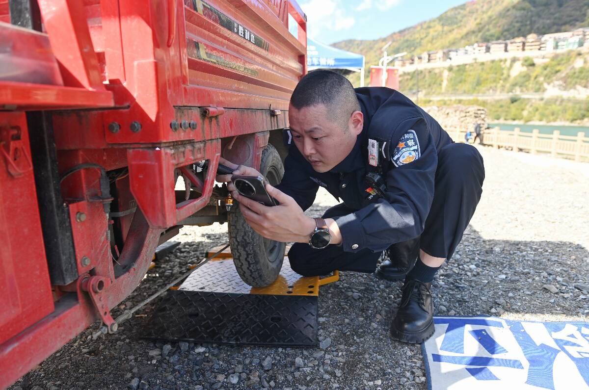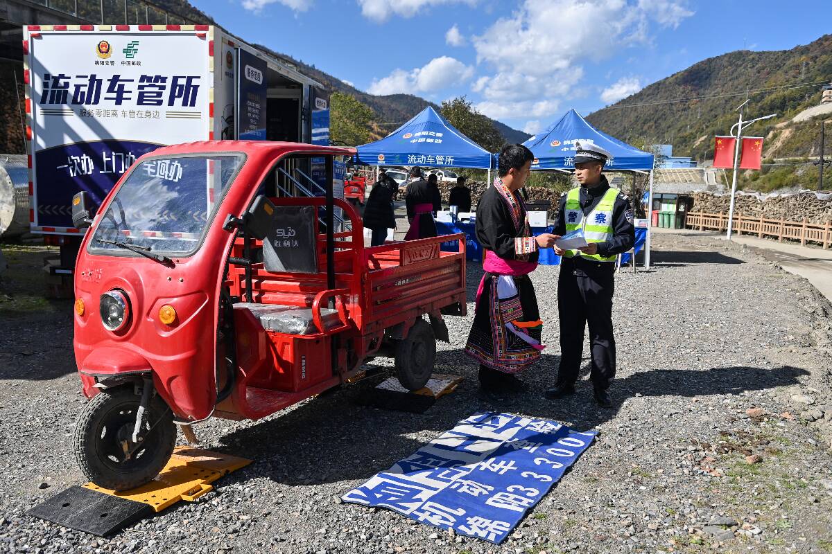 帳篷前的空地上,民警正利用便攜式電子稱對一輛三輪摩托車進行稱重查驗。“農村地區(qū)有很多這種拉貨載物的三輪摩托,就拿白馬鎮(zhèn)來講,以前群眾上牌要去80公里以外的平武縣城里的車管所,來回成本高還耽誤時間。許多群眾覺得麻煩就不想上牌照了,這也帶來了很大的交通安全隱患。”現(xiàn)場辦理民警告訴記者,“現(xiàn)在車管服務直通車直接開到村寨里,我們帶了便攜設備對車輛進行現(xiàn)場查驗、受理上戶業(yè)務,手續(xù)資料齊全的情況下,3個工作日內新牌照就能寄遞到群眾家里。”在家門口就能上牌,如此便利也整體提高了摩托車、電動車的上戶率,從源頭夯實了道路交通安全基礎。