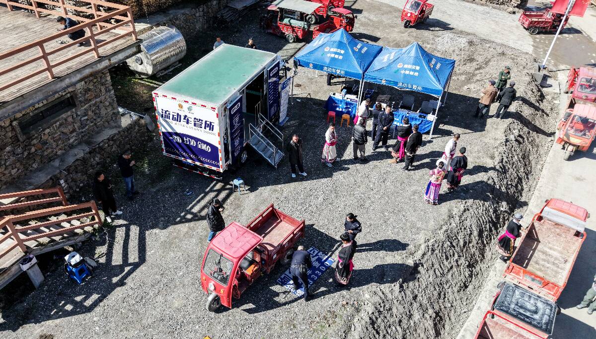 30日中午1時,扒昔加古寨廣場上早已熱鬧起來。車管所民警們帶著全套設備抵達現(xiàn)場,分工協(xié)作搭建臨時辦理點:藍色帳篷穩(wěn)穩(wěn)撐起,塑封機、打印機、電腦等設備一字排開,有條不紊地完成調試;服務直通車接駁電源后,車廂內的電子屏隨即亮起,滾動播放著通俗易懂的交通安全知識;另一側,自助體檢機成功連接醫(yī)院和公安業(yè)務后臺,隨時準備為群眾提供體檢服務。
