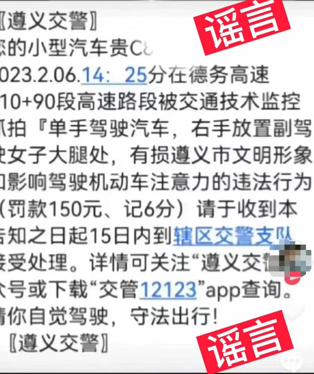 近日,一張短信截圖在貴州省內一些抖音號、微信群內流傳,吊起了不少“吃瓜群眾”的好奇心,短信內容偽造“貴州交警”名義,稱各相關車主在貴州省畢節、貴陽、遵義等地,被交通技術監控設備抓拍“單手駕駛機動車,右手放置副駕駛女子大腿處”,有損文明形象被違法記分,要求在15日內接受處理。