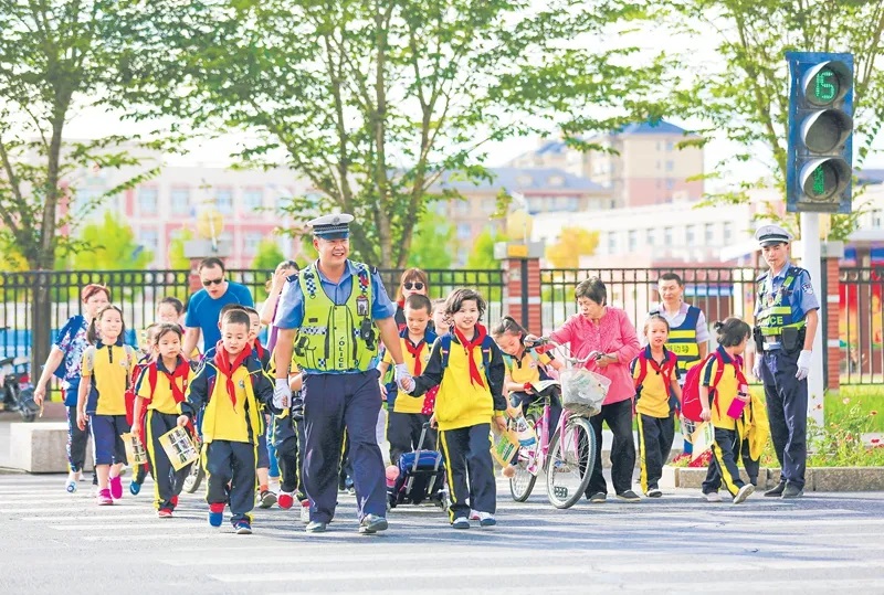 博樂市公安局交警大隊(duì)民警護(hù)送小學(xué)生過馬路(2019年8月27日攝)。馬玲香攝