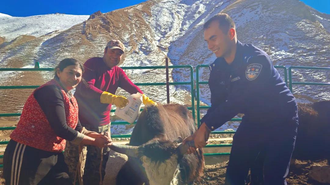 與這片豐收的喜悅遙相呼應,在數十公里外的三連,雪山已染上零星白雪。輔警肉斯塔木正蹲在牦牛群旁,熟練地調配藥浴藥液。“每頭牛都要泡到位,這樣驅蟲效果才好。”他一邊引導牧民將牦牛趕入水池,一邊重復著注意事項。冰冷的藥水濺濕了褲腳,他卻毫不在意。歷時3個多小時,為牧民艾合買提家的30多頭牦牛全部完成了藥浴,他才松了口氣。牧民們望著他凍得發紅的臉頰,豎起了大拇指。