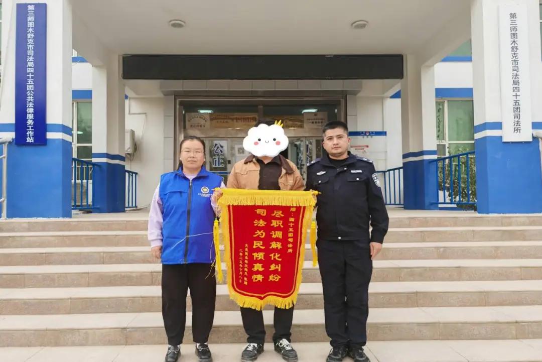 司法的溫度從不設界限。10月15日,麥蓋提縣某農資店經營者鮑某專程趕來,將一面錦旗送至45團司法所。