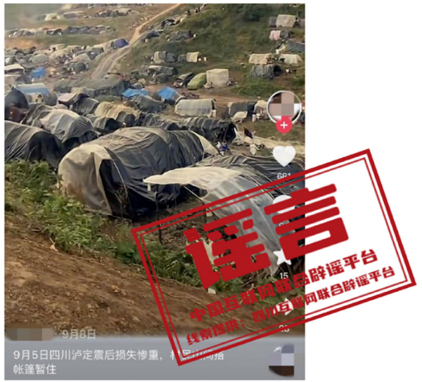 這類謠言往往通過(guò)移花接木拼湊而成,有的冒用不相干的圖片或視頻企圖自證,有的依靠PS等拼接技術(shù)進(jìn)行偽造,還有的利用人工智能和大數(shù)據(jù)生成仿真音視頻信息。如“重慶嘉陵江被曬干了,兩名男子騎摩托車橫渡嘉陵江”“四川地震后村民在山腳下自搭帳篷居住”等謠言,均屬于用“移花接木”手法編撰的虛假信息:前者實(shí)為水位降低的自然情況,橫渡視頻的拍攝地點(diǎn)是長(zhǎng)江珊瑚壩而非嘉陵江;后者則是四川樂(lè)山筍農(nóng)打筍時(shí)臨時(shí)搭建的休息帳篷。此外,“浙江寧波北侖、慈溪被水淹”等視頻還采用特效合成手法制造謠言,著實(shí)居心不良。