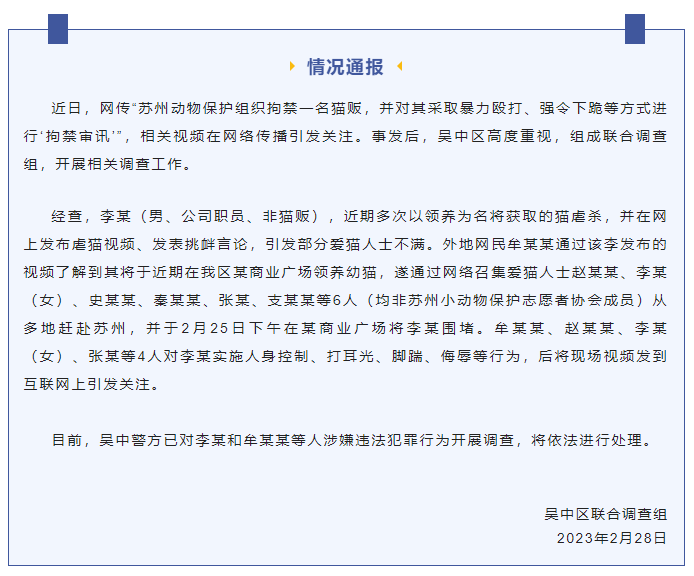 近日,網(wǎng)傳“蘇州動(dòng)物保護(hù)組織拘禁一名貓販,并對(duì)其采取暴力毆打、強(qiáng)令下跪等方式進(jìn)行‘拘禁審訊’”,相關(guān)視頻在網(wǎng)絡(luò)傳播引發(fā)關(guān)注。事發(fā)后,吳中區(qū)高度重視,組成聯(lián)合調(diào)查組,開展相關(guān)調(diào)查工作。