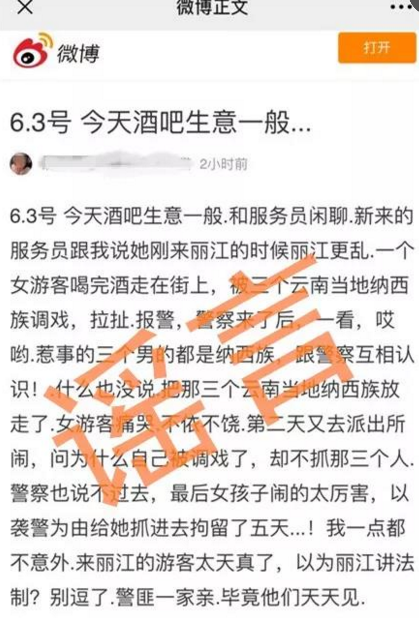 2019年6月3日,一網(wǎng)民通過新浪微博發(fā)布了主要內(nèi)容為三名麗江本地男子調(diào)戲女游客,女游客報(bào)警后警察不作為,還以襲警為由將女游客行政拘留5日的微博。